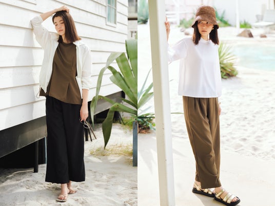 スイムウエアでは珍しい脚を隠せるワイドパンツや、普段着使いできるマンパ・セットアップ等がお目見え