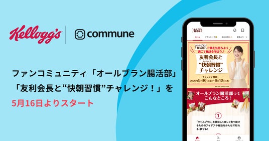 コミュニティサクセスプラットフォーム「Commune(コミューン)」を提供するコミューン株式会社は、日本ケロッグ合同会社が運営するファンコミュニティ「オールブラン腸活部(※1)」にて、新たなキャンペーン企画「友利会長と“快(かい)朝(ちょう)習慣”チャレンジ!」と、大人気のレシピ募集企画「ちょい足し快腸AWARD」第3弾を2025年5月16日(金)より開始することをお知らせします。本企画には「オールブラン」公式アンバサダーの友利新さん(医師)も参加し、部員の腸活をサポートします。
