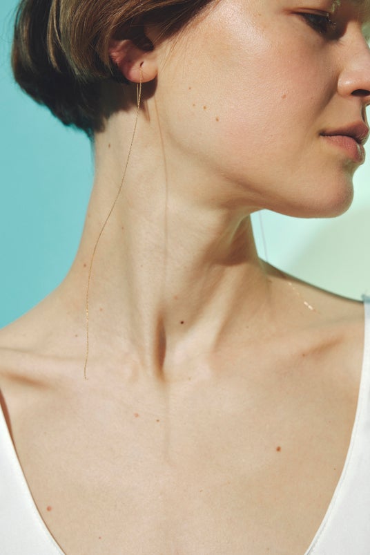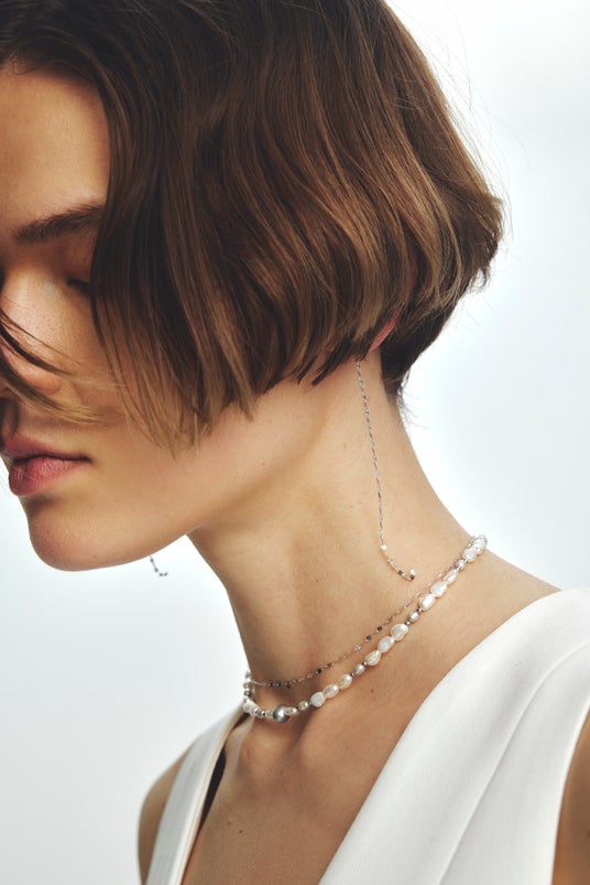 繊細で楚々とした雰囲気があるチェーンが、顔の動きに合わせてのびやかに揺らめいて、身につける人の柔らかさを引き立てながら意志ある横顔をつくり出します。