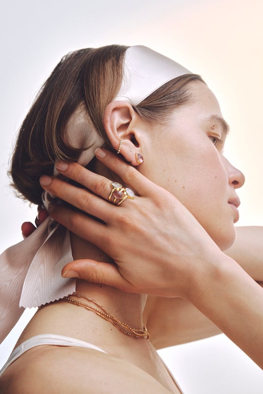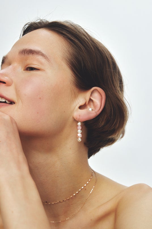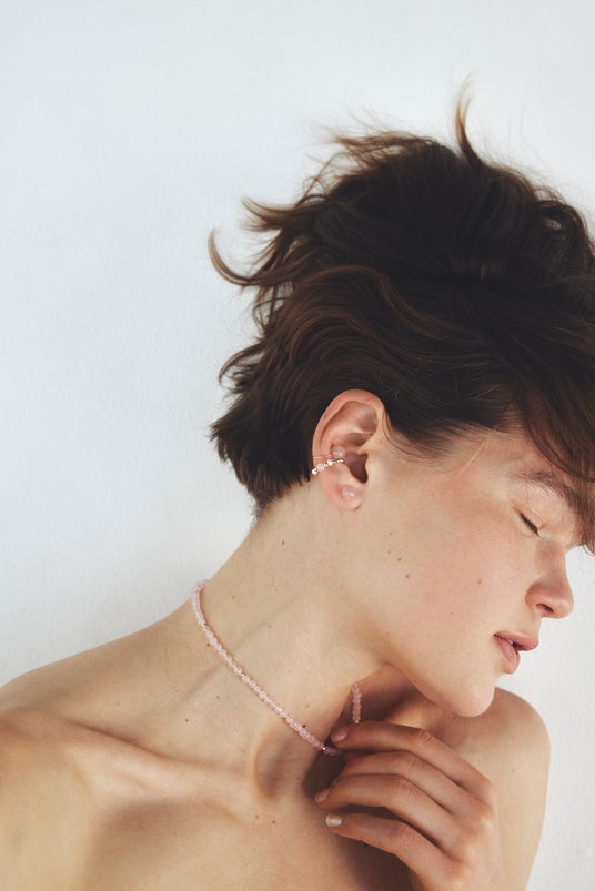 着用すると耳の側面にローズクォーツが浮かぶように乗り、エレガントな色気を上乗せしてくれます。