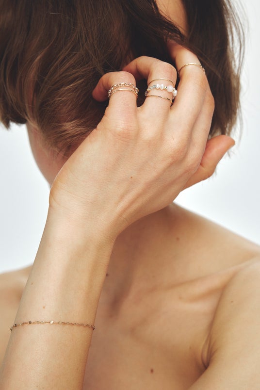 華奢なゴールドリングと組み合わせて着用すると、メリハリの効いた仕上がりに。