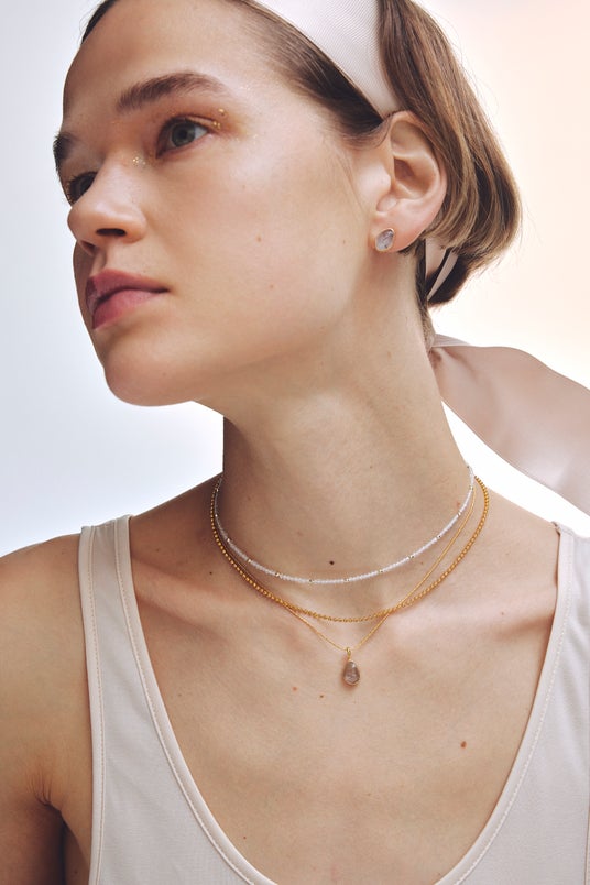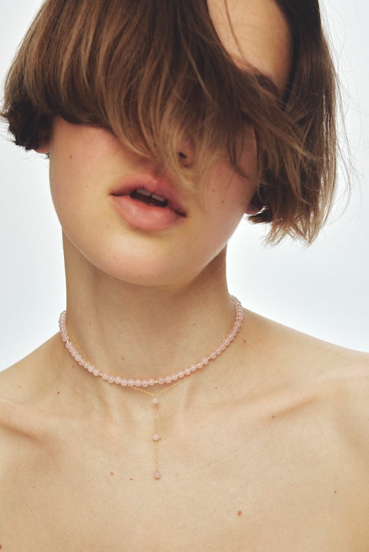 可憐さと豊かさのあるローズクォーツが、肌を柔らかく、表情を優しく演出します。