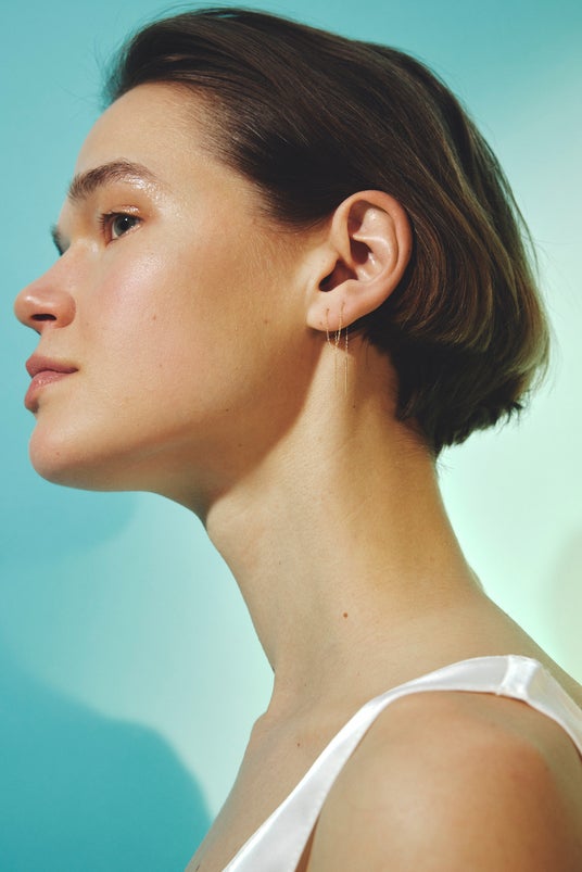 全長20cmのロングシルエットは、2つのピアスホールに通すことも可能。