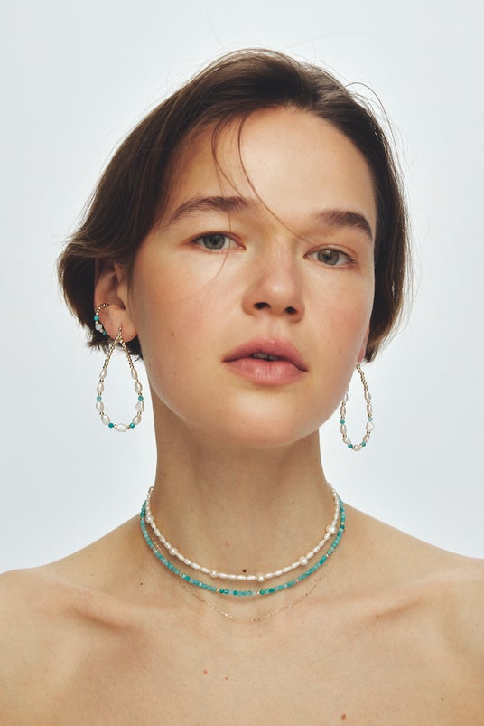 淡水パールとアマゾナイトによる清らかさに、重厚感のあるグレーパールが合わさって、耳元に奥行きある美しさをもたらします。