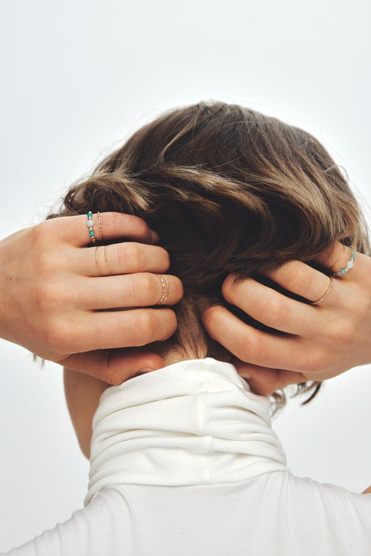 華奢なゴールドリングとコーディネートして緩急をつけるほか、色違いのリングを重ねて指先にボリュームを出しても素敵。