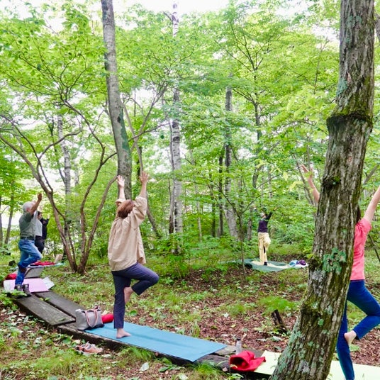 日常の喧騒から離れ、ガイドの誘導で優しい森の自然の中に自身を溶け込ませていくことで、心身の緊張を解きほぐす機会を創出していきます。8月と12月には、ヨガ講師を招いて、森の中で森ヨガも開催します。