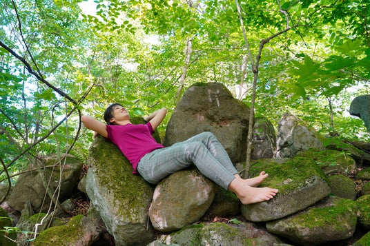 石に腰掛け、苔を撫で、五感で自然との対話を楽しむひととき。