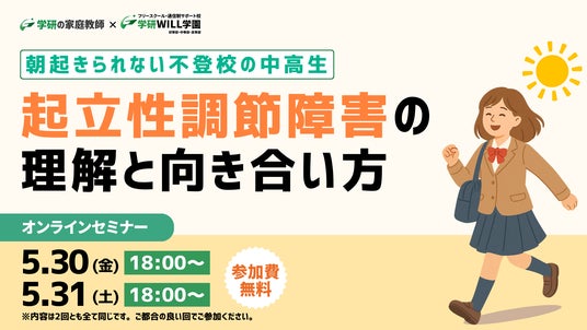 株式会社 学研ホールディングス(東京・品川/代表取締役社長:宮原博昭)のグループ会社、株式会社 学研エル・スタッフィング(東京・高田馬場/代表取締役社長:伊藤弘雅)は、展開する「学研WILL学園」「学研の家庭教師訪問支援室」で数多くご相談をいただいている起立性調節障害への見識を深めていただくため、2025年5月30日(金)と5月31日(土)に「朝起きられない不登校の中高生~起立性調節障害の理解と向き合い方」無料オンラインセミナーを開催いたします。