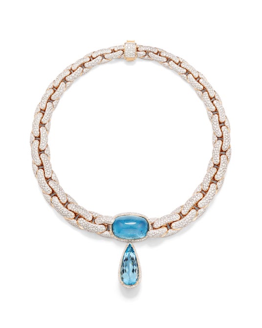このマスターピースは、シグネチャーのフォルサチェーンデザインを巧みに再解釈し、このボリュームならではの遊び心を見せています。バックは快適さを重視して細めに、前面に向かって徐々に大きくなるリンクによって豊かな重厚感を演出しています。デザインの中心には、形とカットの対比が美しい2つのアクアマリンがあしらわれています。一つは37.98カラットの丸みを帯びた長方形のカボションカット、もう一つは15.95カラットのファセットカットのドロップ型ペンダントです。各ストーンはダイヤモンドパヴェで包み込まれ、チェーンのリンク部にはホワイトダイヤモンドがセッティングされています。リンクは地中海の波のようにしなやかに動き、優雅な輝きを放ちます。