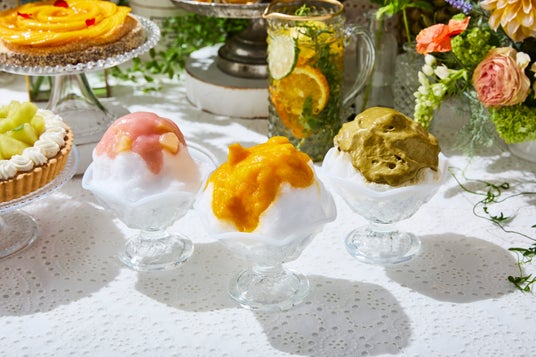 お客様のお好みに合わせ、パティシエが目の前で仕上げます。ごろごろと入った果実が嬉しい「マンゴーのトロピカル仕立て」、ほろ苦いほうじ茶が香る「ほうじ茶のエスプーマ仕立て」、みずみずしい桃を贅沢にトッピングした「切りたて桃のフレッシュ仕立て」の3種をご用意しました。