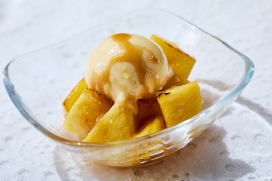 ライブキッチンでパイナップルに洋酒を加えフランベすることでアルコールを飛ばし、香りと風味を引き立てました。ひんやりとした自家製ココナッツアイスを添えてご提供します。パイナップルが炎に包まれるフランベのパフォーマンスにも注目です。