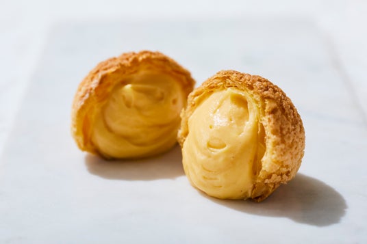 サクッとしたクッキーシュー生地とバニラビーンズたっぷりの絞りたてカスタードのとろっとした食感がたまらない逸品です。トッピングのフルーツは桃かマンゴーからお選びいただけます。