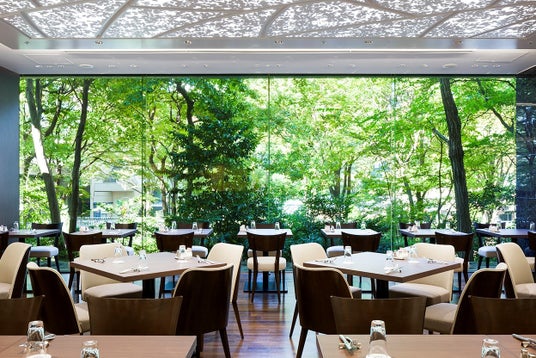 <樹林>の大きな窓辺に広がるのは、造園家・深谷光軌氏が1971年の開業時に手掛けた雑木林庭園。武蔵野の原風景を再現した深緑のパノラマは、「みどりの新宿30選」(※)にも選ばれており、都会の中心でありながら緑豊かな景観に心癒されつつ、優雅なひと時を過ごすことができます。