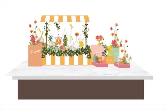 お料理だけでなく、店内の随所にフルーツや花の装飾を施すことでご来店いただいたお客様を「スイーツガーデン」の世界にお連れします。入口のウェルカムフォトブースやライブキッチン、アートツリー、パフェコーナーなどを鮮やかなサマーフルーツや彩り豊かな花で華やかに飾り、一目でスイーツガーデンに引き込まれるような空間を演出しSNS映えを図ります。