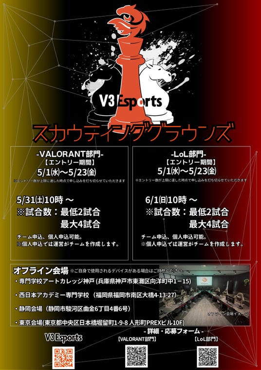 学校法人神戸学園が運営するプロeスポーツチーム『V3Esports』では、将来のプロ選手発掘を目的とした初の試み「V3 Esports スカウティング・グラウンズ」を開催いたします。