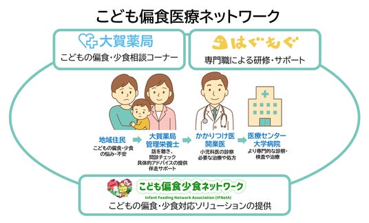 NPO法人はぐもぐ(本部:福岡市 代表理事:小浦ゆきえ)は、日本初の新しい医療ネットワーク「こども偏食医療ネットワーク」を、株式会社大賀薬局(本社:福岡市)、合同会社こども偏食少食ネットワーク協会(本社:大阪府 以下、IFNetA)と共同で始動します。この取り組みでは、大賀薬局の店舗内に「こどもの食の相談コーナー」を開設し、専門資格を持つ管理栄養士が無料で相談を受付けます。そして、必要に応じて小児科・小児歯科などの医療機関とも連携するという、新たな地域医療ネットワークを構築します。