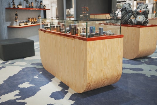 商品を展示しているディスプレイ棚は、ブランドを象徴するアイテム「ROCKING HORSE(ロッキンホース)」のウッドソール部分をイメージしたシルエットで、レッドカラーのテーブルがアクセントとなりプレイフルな雰囲気に。