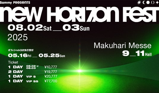 サミー株式会社(本社:東京都品川区 代表取締役 社長執行役員 COO:星野 歩)は、 2025年8月2日(土)、8月3日(日)に幕張メッセ 9~11ホールで開催する当社初の主催音楽フェスティバル「Sammy presents NEW HORIZON FEST」の第3弾アーティスト発表およびチケット第3次先行販売を開始いたします。