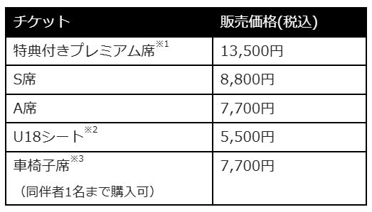 ※1 特典:良席保証(前から5列目以内)、オリジナルグッズ(クッションほか)、オリジナルプレイヤーカード(ランダムの5枚セット)、プレミアム席優先入場ゲート(開場の10分前からご入場いただけます。)