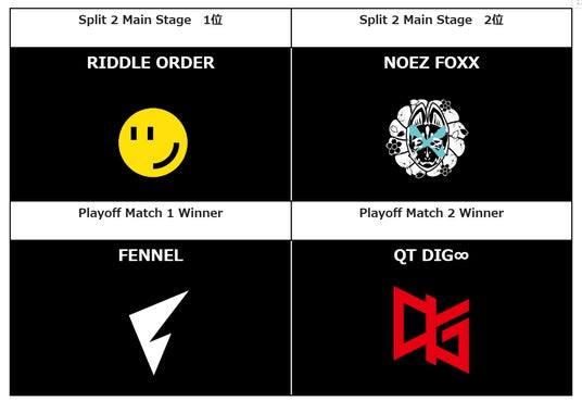 今回の「Split 2 Playoff Finals」には、熾烈な戦いを勝ち抜いた4チーム RIDDLE ORDER、NOEZ FOXX、FENNEL、QT DIG∞が出場します。いずれも高い実力を誇るチーム同士の激突が予想され、優勝の行方に大きな注目が集まっています。大会をより一層お楽しみいただけるよう、試合や観戦企画、来場者特典、ブース出展、オフィシャルグッズなどの情報を以下にまとめました。