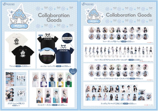 コラボレーションカフェ限定のオリジナルグッズも販売!アパレルブランド『スピンズ』によるアパレルの展開やその他推し活に使えるアクリルスタンドや缶バッジなど、日々の”推し活”がより華やかになるようなグッズをご用意します。