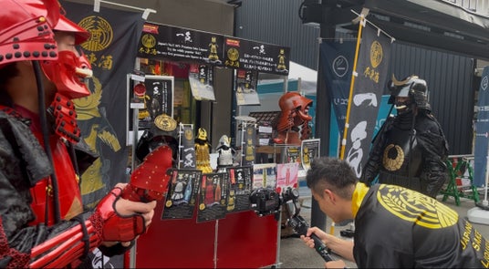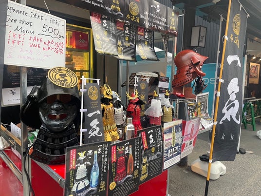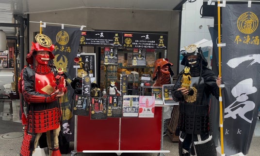 甲冑を着たインパクト抜群の“サムライ”たちが、観光客に囲まれながら、【ショット専用】日本酒リキュール「一気」を自ら手売り中です!