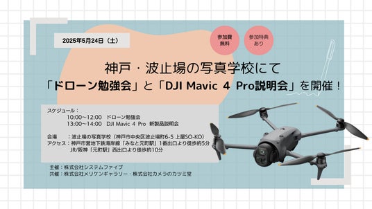 株式会社システムファイブ(本社:東京都千代田区、代表取締役社長:小川 行洋)は、2025年5月24日(土)に波止場の写真学校(神戸市中央区)にて「ドローン勉強会」と「DJI Mavic 4 Pro 説明会」を開催いたします。
