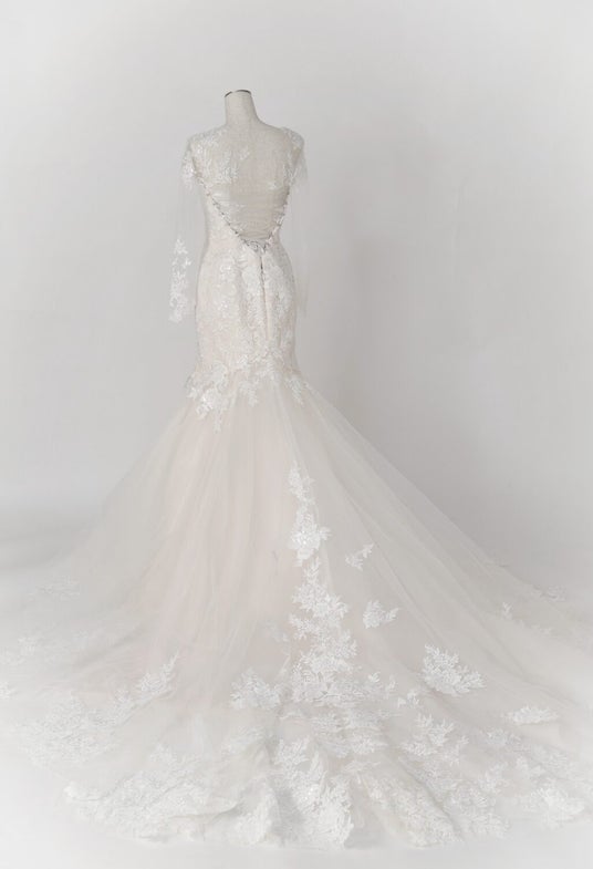 豪華で華やかなマーメイドラインのドレス。エレガントな総レースのドレスはサイズ調整も可能なサイズフリー。多くのお嫁様に着ていただけるようオリジナルでオーダーさせていただきました。