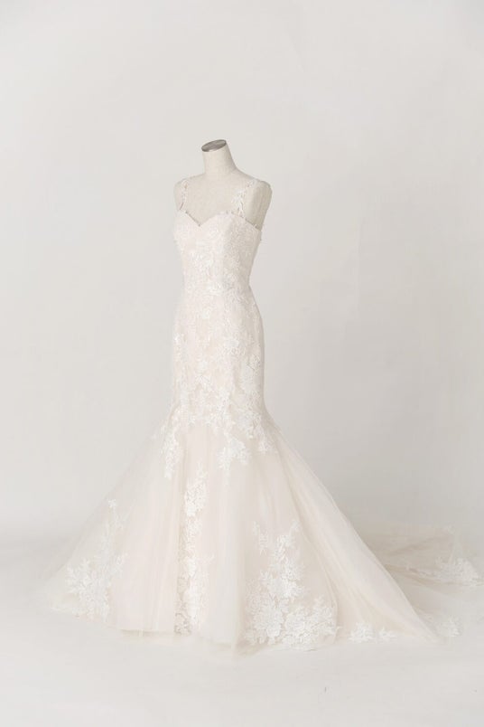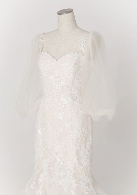 さまざまなデザインのレースを組み合わせた総レースの繊細なドレス。少しレトロ感漂う、クラシカルで華やかなデザイン。柔らかな質感で肌馴染みが良いのも人気ポイントの1つです。
