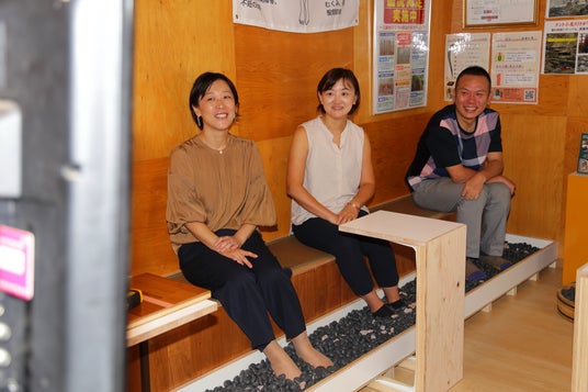 講座をおこなう場所はラドン温浴 新所沢店の名物「足石湯」。遠赤外線シートと遠赤玉石を使った「お湯を使わない足湯」で、足元をポカポカと温めながら、気持ちよく参加できます。