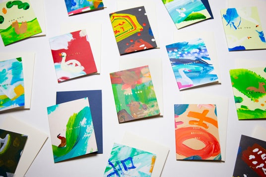 言葉にできない気持ちは、アートに乗せて。印刷ではなく、全て手描きの一点もののメッセージカードは、贈る人にも贈られる人にも特別なひとときを届けます。手描きなので、裏面に絵の具が付着していたり。そんなアーティストの手仕事感も一点ものの良さです。