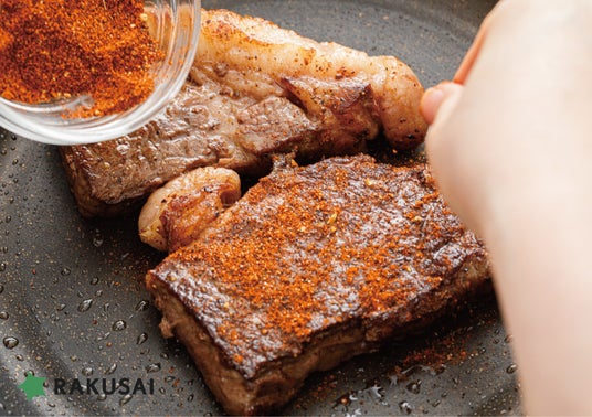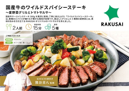 この度新発売となる『国産牛のワイルドスパイシーステーキ ~夏野菜グリルとトマトサルサ~』は、国産牛サーロインステーキ300g を贅沢に使用し、丁寧に焼き上げたメインとなる一品です。口に入れた瞬間、芳醇なスパイスの香りが広がる国産牛サーロインステーキは、とろけるような柔らかさと濃厚な旨みが自慢。香ばしくグリルした5種類の夏野菜と、RAKUSAI オリジナルトマトサルサの爽やかな酸味が、お肉の美味しさを一層引き立てます。