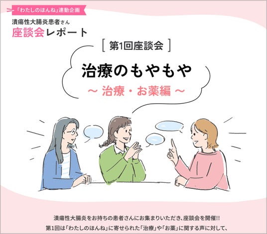その一環として、匿名で投稿できるプラットフォーム『わたしのほんね』に寄せられた声をもとに、潰瘍性大腸炎患者さん3名と座談会を実施。「治療のもやもや~治療・お薬編~」をテーマに、心の中の“ほんね”、治療変更のきっかけや医師とのコミュニケーションなどの体験談について語り合いました。