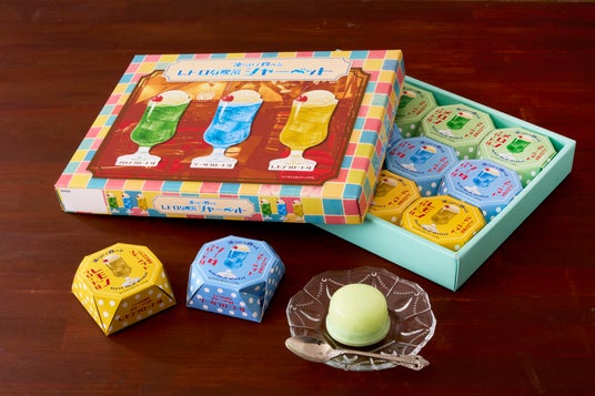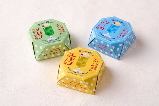 “昭和レトロ”を思わせる、懐かしのソーダフロートをイメージしました。常温保存可能な凍らせて食べるシャーベットで、2層構造となっています。メロンソーダ味、ソーダフロート味、レモンフロート味とミルクの層を混ぜ合わせるとフロートのような味わいを楽しめます。ソーダのようなシャリシャリ感とミルクアイスのような滑らかさが楽しめます。メロンソーダ味、ソーダフロート味、レモンフロート味の3種類展開で、12個入り、6個入りとなっています。パッケージも懐かしい喫茶店をイメージし、トレンド感のある昭和レトロな製品となっているため、贈り物として喜ばれるだけでなく、自宅用としてもおすすめです。