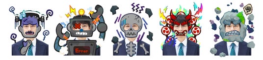 左から「ナーバスフランケン」、「思考停止ロボ」、「ガチガチガイコツ」、「イライラ鬼」、「ムズカシ石」(空気階段 水川かたまりさんのイメージ)