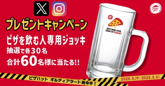 2025年5月19日(月)より、ピザハット公式Xアカウントと公式Instagramアカウントにて抽選で30名様ずつ計60名様に、ギルティアラート発令中につき、【ピザを飲む人専用ジョッキ】が当たるプレゼントキャンペーンを開催いたします。