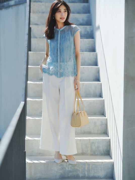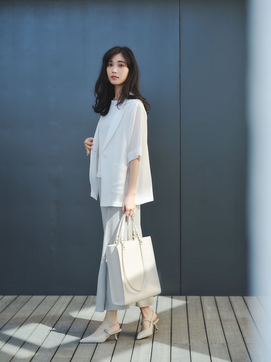 Blouse ¥19,800 Pants ¥19,800 Bangle (set) ¥5,280 Pierced Earrings ¥5,280 Bag ¥15,400 Pumps ¥17,600