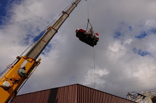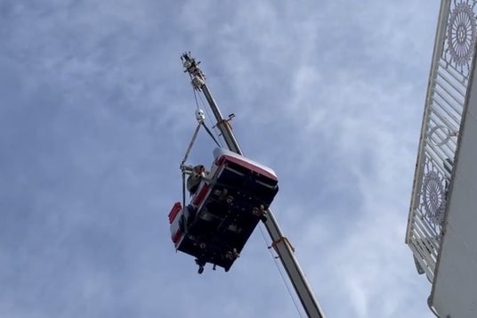 運搬時はクレーンにつられて、車体がレールから外されます。車体が浅草の空を飛ぶ様子は花やしきスタッフも心が躍る瞬間です!2025年の法定検査では、点検に向かう5月20日(火)と点検から戻る7月11日(金)に空を飛びます。
