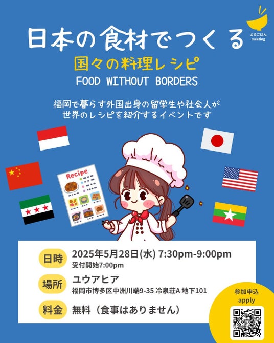 一般社団法人YOU MAKE IT(本社:福岡県福岡市、代表理事:Kenji Umeki)は、2025年5月28日(水)、福岡市博多区のコミュニティスペース「YOU ARE HERE(冷泉荘内)」にて、在留外国人と地域住民が交流する多文化イベント「よるごはんmeeting~Food without borders~」を開催いたします。