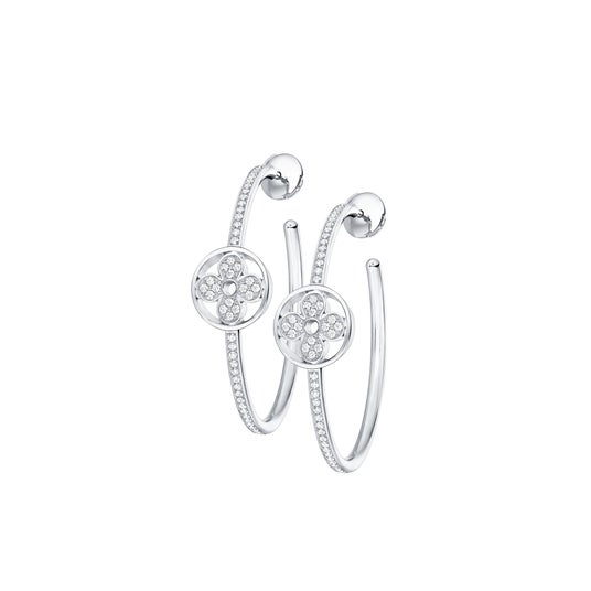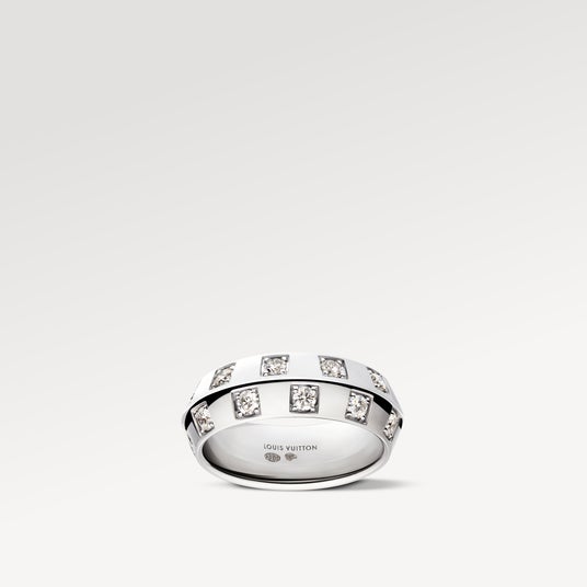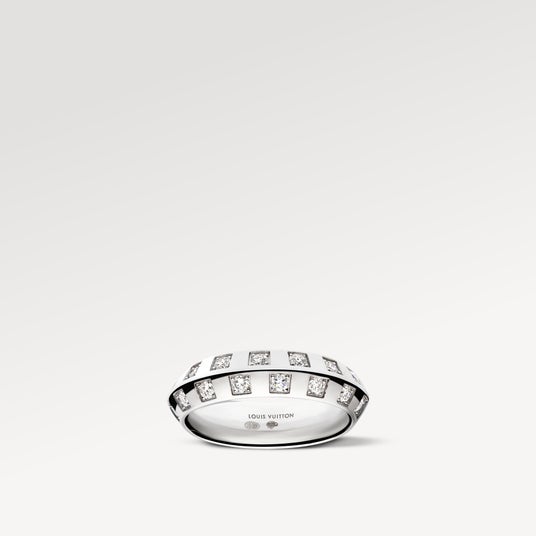 また、メゾンのファインジュエリーコレクション「イディール ブロッサム」より、ホワイトゴールドにダイヤモンドがあしらわれたフープピアスと、「ル ダミエ ドゥ ルイ・ヴィトン」より、ホワイトゴールドとダイヤモンドのリングを着用しました。