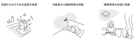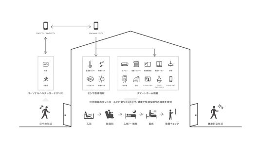 この度、実証ユースケース「もっとグッスリ(More IoT for good sleep)」では、株式会社FiNC Technologiesの「FiNCアプリ」と沢井製薬株式会社の「SaluDiアプリ」の健康データを活用し、日中の活動量や体調を把握します。そして、LIXILの「Life Assist2アプリ」を通じて、入浴~入眠~睡眠中~起床時という一連の流れの中で、適切なタイミングで住宅機器のコントロールや行動リコメンドを実施します。これにより、個人に合わせた快適な睡眠を誘導し、健康で心地よい毎日を送ることができるようになることを目指します。
