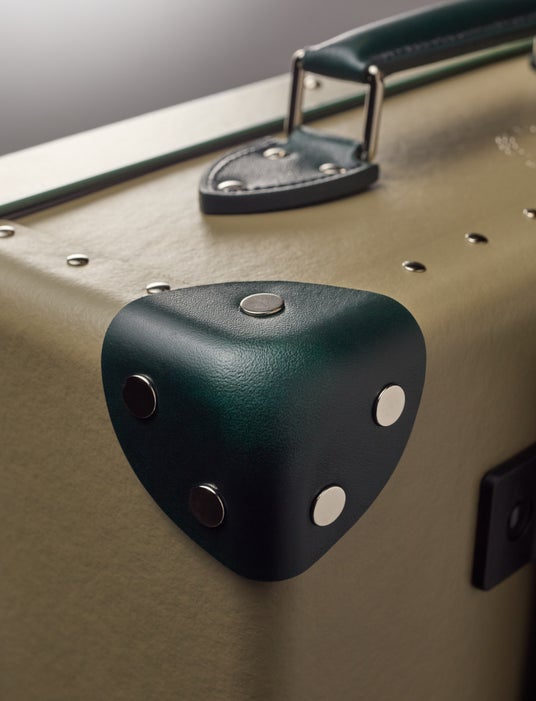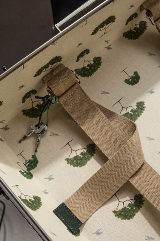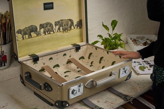 グローブ・トロッター×エレファント・ファミリーの新コレクションは、アジアゾウの生息地である森林の色合いを反映し、アースカラーのオリーブ色のヴァルカン・ファイバーのボディに、ダークなケリーグリーンのレザートリムをあしらっています。 ケースの蓋を開けると、アーティストのレベッカ・キャンベル氏による、移動するアジアゾウの家族を描いた「The Parade」がスーツケースの中に表れ、目的地に着くまでゾウの群れと一緒にいることで安全な旅路を約束してくれます。