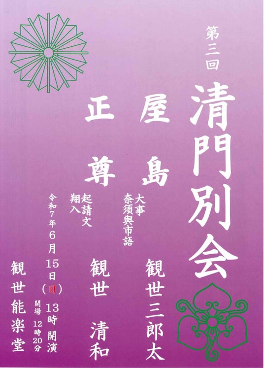 観世会は、来る2025年6月15日(日)に観世能楽堂(GINZA SIX B3F)にて「第3回 清門別会」を開催いたします。