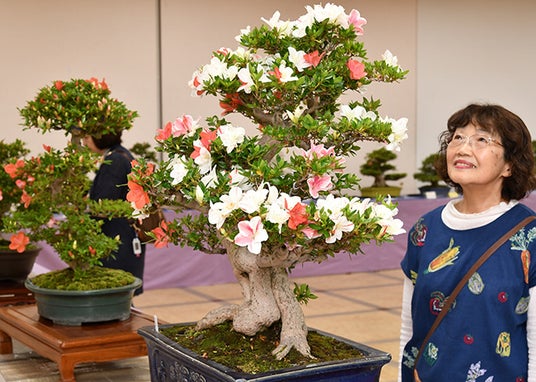 サツキの樹形は、幹が模様を描くように曲がった「模様木」、直立した一本木の型「直幹」、茎や枝が鉢の外に長く垂れ下がった「懸崖」など様々で、会場を訪れた人の目を楽しませてくれます。中には、樹齢が70年を超える古木や高さが80センチメートルを超える大迫力の盆栽も。初夏を彩る行事にぜひご参加ください。