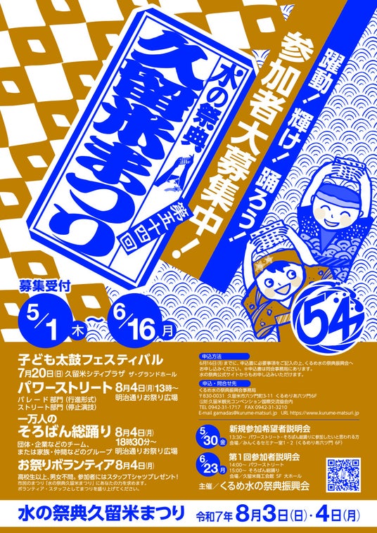 令和7年8月4日(月)に「第54回水の祭典久留米まつり」が開催されます。明治通りが舞台となる「パワーストリート」と「一万人のそろばん総踊り」の参加者を募集します。パワーストリートは13時から、そろばん総踊りは18時30分から開始予定。企業や団体、家族や友達などのグループで申し込めます。また、新規参加希望者向けに説明会も開催いたします。