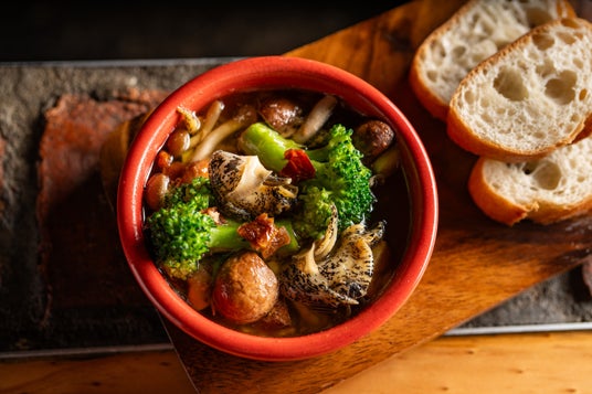 十勝の大樹漁港で水揚げされる食感のよい<つぶ貝>と十勝産の濃厚で野性的な風味が特徴のマッシュルーム<とかちマッシュ>の旨味をたっぷり味わえるアヒージョです。