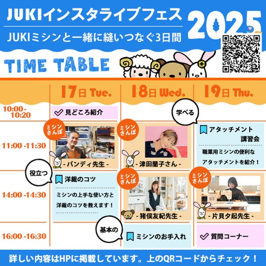 JUKI株式会社(本社:東京都多摩市、以下「JUKI」)は、ソーイングの新たな楽しみ方をご提案する、家庭用ミシンのオンラインイベント「JUKIインスタライブフェス2025 ~JUKIミシンと一緒に縫いつなぐ3日間」を、Instagramのライブ配信を活用して6月17日~19日の3日間開催します。