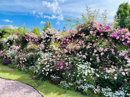 約400種1000本のバラが咲き誇り、多様な植物たちとの調和とコントラストが楽しめます。7つの小部屋に分けられたローズガーデンでは、場面ごとに変わる雰囲気、色彩、香りの違いを味わうことができます。人気の「ガーランドガーデン」では、どっしりと曲線を描いたつるバラが連続し、そのボリュームに圧倒されます。その他にも、ブルガリア大使からいただいたバラを植栽している「ブルガリア友好花壇」や、限定日数で行う「朝のローズガーデン特別公開」も見どころ。バラの見頃予想は6月上旬です。