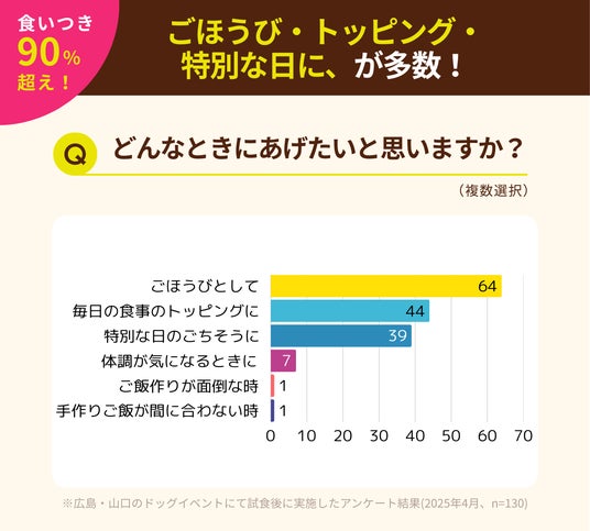 開発に先立ち実施した試食会では、130名の飼い主のうち90%以上が「とてもよく食べた」と回答。「ごほうびや特別な日にあげたい」「冷凍でも使いやすい」などの声も多く寄せられ、実際の感想からは、「お野菜たっぷりで美味しそうでした」「食べると嬉しい」などの温かい反応がありました。