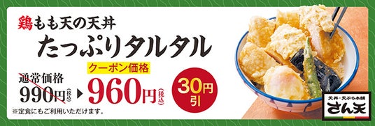さらに「天丼・天ぷら本舗 さん天」公式アプリでは、フェア商品でお使いいただける30円引きクーポンを配信いたします。ぜひ、お得にご利用ください。